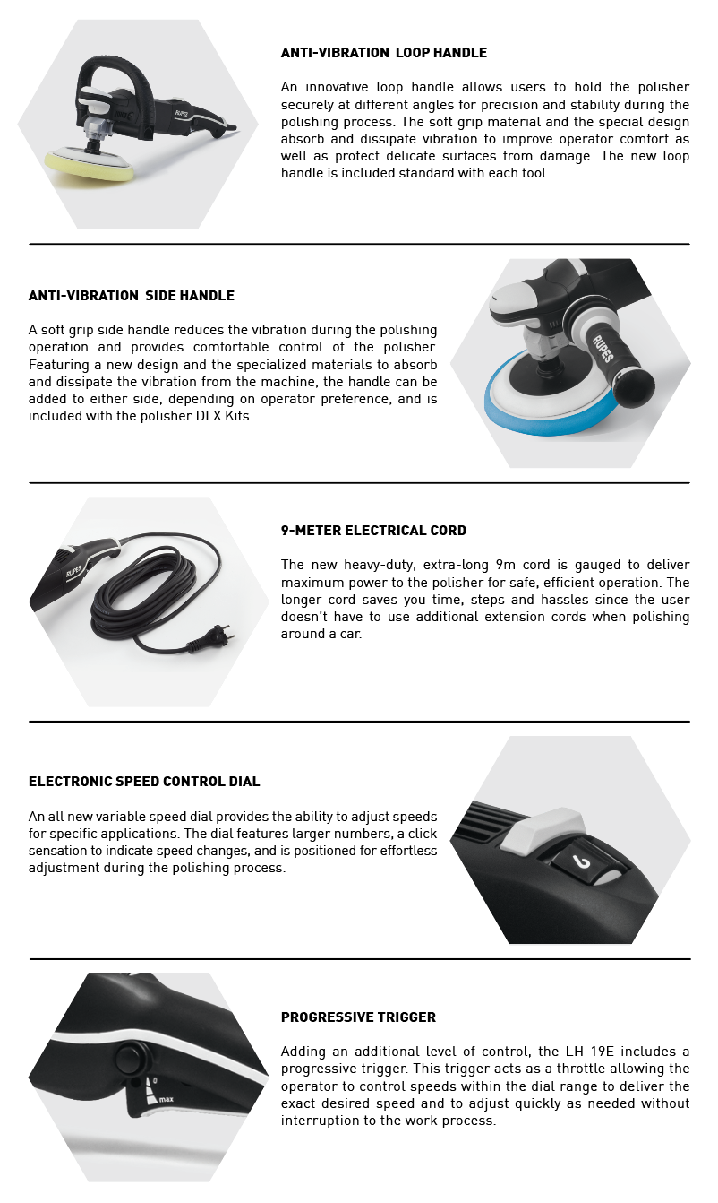 Featuring a high torque motor, compact design, premium ergonomics and a lightweight housing, the LH 19E is one of the most capable and maneuverable rotary polishers on the market. Its lightweight and powerful design makes it the ultimate rotary polishing solution for a variety of industries including automotive detailing, collision repair and refinishing, marine, and more.